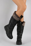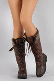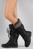 These faux fur cuff design, lace up front closure with metallic D-ring eyelets, rounded toe, and low heel. Finished with cushioned insole and soft interior lining for all day comfort.