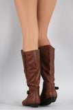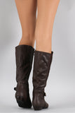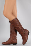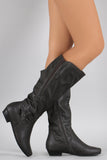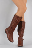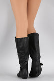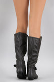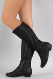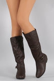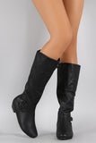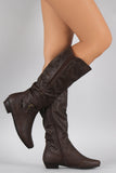 These edgy knee high boots feature a round toe silhouette, vegan leather shaft with partial elastic gore insert, top stitching accents, and low stacked heel. Finished with cushioned insole, soft interior lining, and full-length side zipper closure for easy on/off.