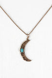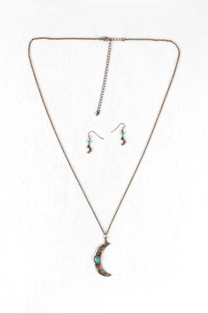 A thin crescent pendant necklace with etched designs, a faux turquoise stone, and matte antique finish. Finished with an adjustable lobster hook closure and includes matching earrings. Lead and nickel compliant.