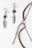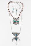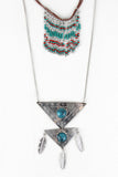 A layered fringe front, jointed triangular metallic plate pendants, and faux turquoise stone centerpieces. Finished with feather charms, adjustable lobster hook closure, and matching earrings. Lead compliant.