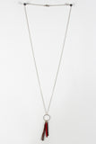 This necklace features a stone spike pendant, a faux leather tassel, and a metallic bar embellishment on a hoop accent. Finished with a fine chain with a lobster hook closure. Lead compliant.