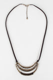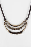 A bohemian necklace featuring vegan leather cord and a cutout metallic frame pendant with hammered texture, tribal designs, and beaded wrapped cord accent. Finished with an adjustable lobster hook closure. Lead, cadmium, and nickel tested.