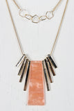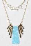 A double layered necklace featuring s link and figure 8 chain, jointed faux gold bars with a faux glass pendant and small pentagon chain detail. Necklace is finished with an adjustable lobster hook closure.