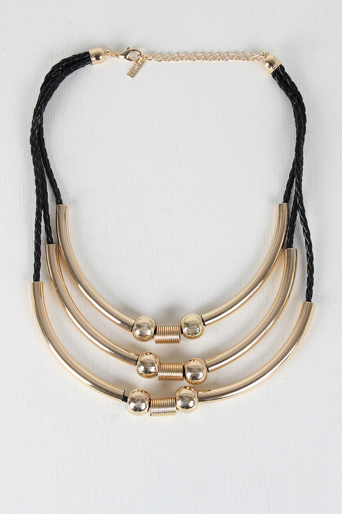 This edgy statement necklace features a braided vegan leather cord, high polished metallic beads and tubes, with an adjustable lobster hook closure and matching earrings with post backs.