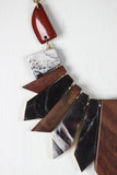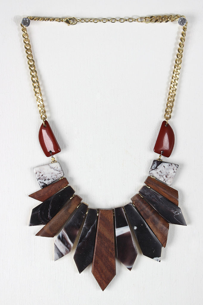 This earthy geometric statement necklace features a hammered curb link chain, wood and faux marble pendants separated be gold tone spacer beads, with two faux stone talon shaped beads, finished with an adjustable lobster claw closeure