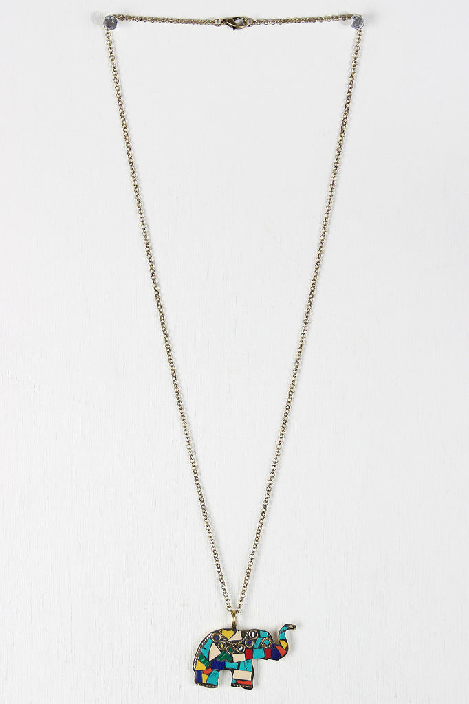 This pendant necklace features a double sided elephant pendant, one side metallic gold and one side a colorful mosaic, on cable link chain, finished with a lobster claw closure.