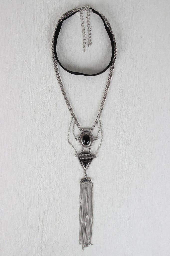 This necklace set features a vegan leather choker, and a tribal inspired chain fringe pendant. both necklaces have adjustable lobster claw closures.