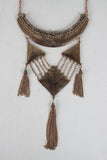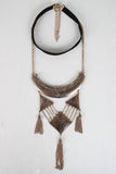 This necklace set features a vegan leather choker, and a tribal inspired statement bib necklace with chain fringe tassels. both necklaces have adjustable lobster claw closures.