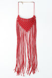 This statement necklace features a bib style design, string cord, macrame triangle piece with long fringe detail, and an adjustable lobster claw closure. Matching earrings included.