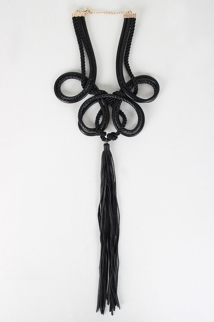 This statement necklace features a loop and knot design wit three different cords, large vegan leather tassel, with and adjustable lobster claw closure, and matching vegan leather tassel earrings.