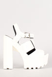 This statement-making lug sole platform heel features a peep toe, strappy leatherette design upper, and chunky platform heel. Finished with lightly padded insole and adjustable ankle strap with side buckle closure.