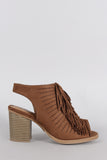 This boho-chic peep toe  fringe  detailing at front, single sole, and chunky stacked heel. Finished with lightly padded insole and side zipper closure for easy on/off.