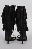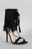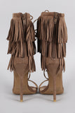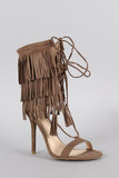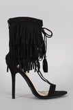 This corseting laces across the open vamp and up to the ankle, the ends are finished with a fringe tassel.
