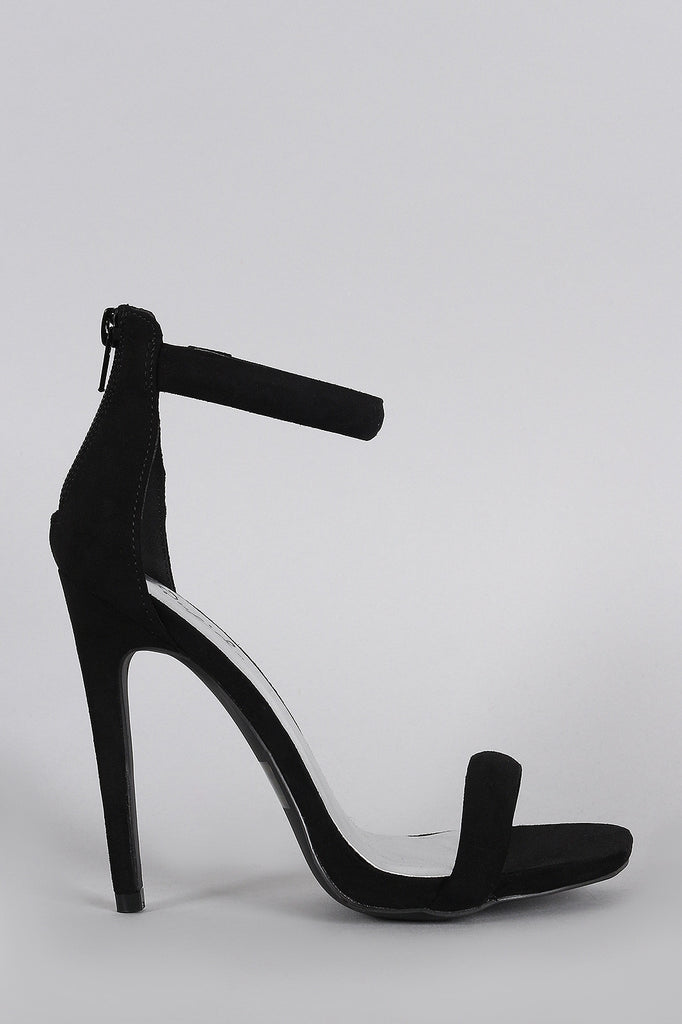 This is a classic open toe heel ; featuring a single strap vamp and an ankle strap. Rear back adjustable zipper closure. Finished on a stiletto heel.