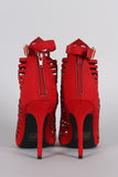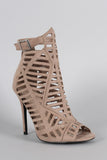 Ankle  booties  featuring a faux suede upper in a geometric cutout cage design, peep toe, and adjustable ankle strap. Booties also feature a wrapped stiletto heel, back zipper closure, and lightly padded insole.