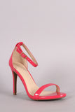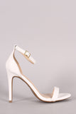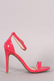 This simple, yet chic open toe heel features a single strap across vamp, ankle strap with adjustable buckle closure, lightly padded insole, and wrapped stiletto heel.