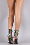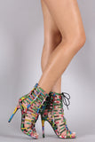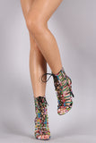 This sizzling hot  floral print  denim throughout, crisscrossed laces corset the caged straps, open toe silhouette, and wrapped stiletto heel. Finished with lightly padded insole and rear zipper closure for easy on/off.