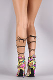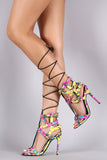 This  floral  pattern design on cage construction, gold-tone nail stud hardware, single sole, stiletto heels, corset lace-up to a self-tie closure, and lightly padded insole for comfort.