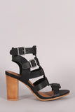 This  heel  features an open toe silhouette, strappy shaft construction with two adjustable buckles accent, chunky faux wooden heel, and lightly padded insole.