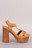This edgy  open toe heel  features a t-strap construction, ankle strap with buckle fastening, chunky faux wooden platform heel, and lightly padded insole for comfort.
