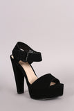 This fabulous heel features an ankle strap with adjustable buckle closure, peep toe silhouette, chunky heel, and wrapped platform. Finished with lightly padded insole for comfort.