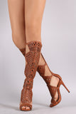 This stunning heel features a peep toe silhouette, geometric cutout design shaft with side buckle accent, low platform, and wrapped stiletto heel. Finished with lightly padded footbed and convenient back-zip closure.