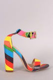 This fabulous heel features a rainbow stripe print or solid vegan leather throughout, single strap across vamp, and chunky wrapped heel. Finished with lightly padded insole and adjustable ankle strap with buckle fastening.