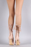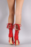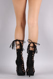 This edgy open toe heel features a tassel lace up front, covered tribute platform, and wrapped stiletto heel. Finished with lightly padded insole and convenient back zip closure.