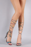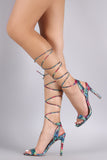 This alluring heel features a python print vegan leather upper, open toe silhouette, single strap across vamp, and wrapped stiletto heel. Finished with lightly padded insole and lace up closure.