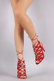 This stunning  lace up  closure, peep toe silhouette, wrapped stiletto heel, and lightly padded insole for comfort.