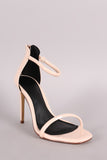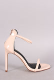 This  open toe heel  features a glossy patent upper, single strap across vamp, ankle strap with a partial elastic insert, and wrapped stiletto heel. Finished with lightly padded insole and convenient back-zip closure.