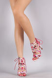 This chic stiletto heel features an open toe silhouette, caged construction, back lace up, single sole, and wrapped stiletto heel. Finished with a lightly padded insole.