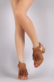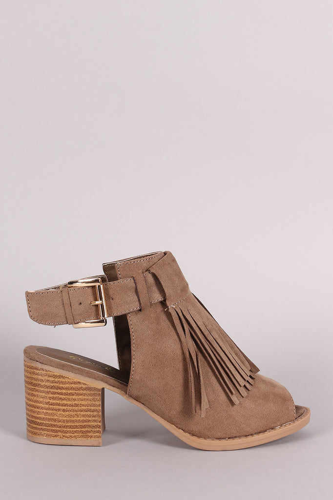 This edgy fringe detail at front, back cutout design with adjustable buckle closure, and chunky stacked heel. Finished with lightly cushioned insole for comfort.