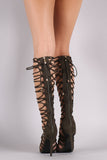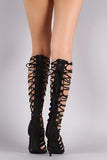 These eye-catching heels feature a soft vegan suede upper, corset style lace up wrap around, peep toe silhoutte, and wrapped stiletto heel. Finished with a lightly cushioned insole and rear zip-up closure for easy on/off.