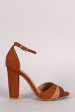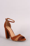 This sophisticated peep toe  heel  features a pleated vegan suede upper constructed with topstitching accent, chunky wrapped heel, lightly padded insole, and adjustable ankle strap with side buckle fastening.