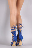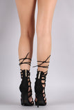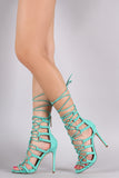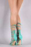 This caged construction up to the ankle, featuring a drawstring looping self-tie corseting laces. Finished with an adjustable rear back zipper.