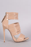 This stiletto heel features a strappy construction with stitched trims, open toe silhouette, lightly padded insole, and tassel back-zip closure.
