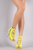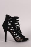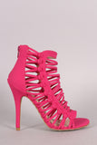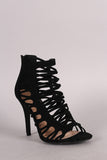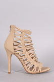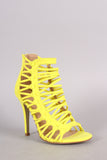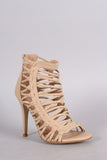 This open toe heel features a slim crisscrossing straps with knotted detail, wrapped stiletto heel, lightly padded insole, and convenient back-zip closure.