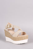 This flatform wedge features an open toe silhouette, asymmetrical straps linen upper with gold accents, woven faux straw midsole, slingback construction, and lug sole. Finished with a lightly padded insole and side buckle closure.