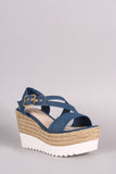 This stylish  flatform wedge  features an open toe silhouette, asymmetrical straps denim upper, woven faux straw midsole, slingback construction and lug sole. Finished with a lightly padded insole for comfort and side buckle closure.