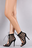 This eye-catching  lace-up  closure, wrapped stiletto heel, and lightly padded insole for comfort.