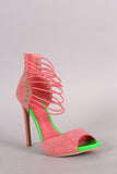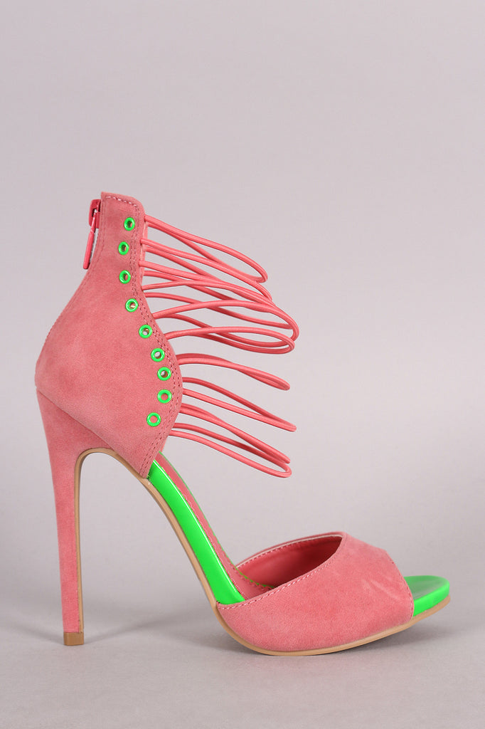 This sophisticated heel features a peep toe silhouette, strappy elasticized ankle cuff with grommets accent, and wrapped stiletto heel. Finished with lightly padded insole and rear zipper closure for easy on/off.