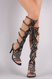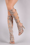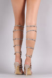 This stunning heel features a strappy caged design shaft, sparkling glitter shaft with rhinestones embellishment, side buckles accent, open toe silhouette, and wrapped stiletto heel. Finished with a lightly padded insole for comfort.