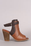 These peep toe  booties  feature a colorblock vegan leather upper, back cutouts design with an adjustable ankle strap closure, chunky stacked heel, and cushioned insole for comfort.