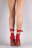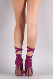 This open toe heel is on a leg-lengthening platform and stiletto heel. Designed with crossing straps cage, featuring an ankle self-tie wrap.