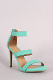 This gorgeous heel features an open toe silhouette, triple scalloped straps, and wrapped stiletto heel. Finished with lightly padded insole and rear zipper closure for easy on/off.