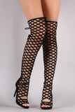 This over-the-knee  heel  features a geometric cutout design throughout, open toe silhouette, and wrapped stiletto heel. Lightly padded insole and back zipper with partial lace-up closure.