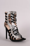 This fashionable heel features a strappy caged construction with python print vegan leather trims, open toe silhouette, knotted detail at side, and wrapped stiletto heel. Finished with lightly padded insole and convenient back-zip closure.
