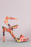 This fabulous heel features a watercolor print fabric throughout, open toe silhouette, and one band across vamp. Finished with a lightly padded insole, double ankle strap with buckle fastening, and wrapped stiletto heel.