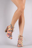 This vibrant heel features a neon watercolor print design, strappy cutout with corset lace-up closure, peep toe silhouette, and chunky heel. Finished with a lightly cushioned insole and side zip-up closure.